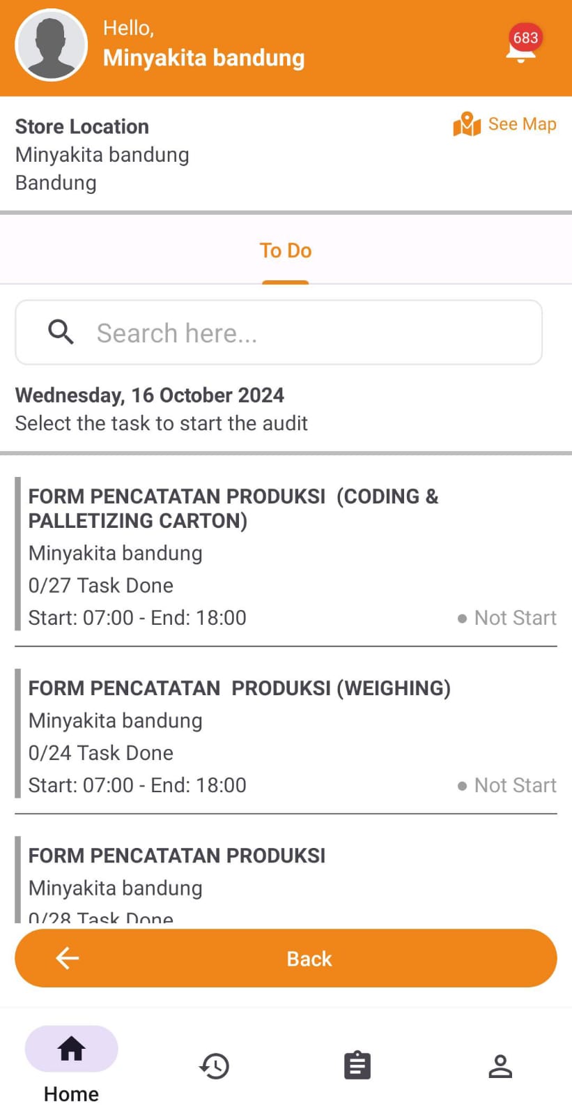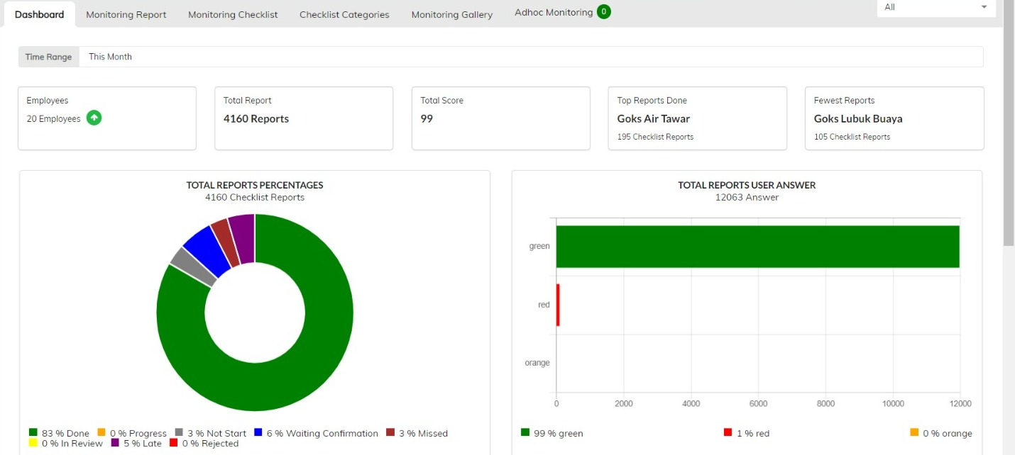 The backoffice dashboard offers a centralized view of all tasks, user reports, and submitted media, allowing supervisors to track progress, manage tasks, and resolve issues efficiently with custom filters and detailed analytics.